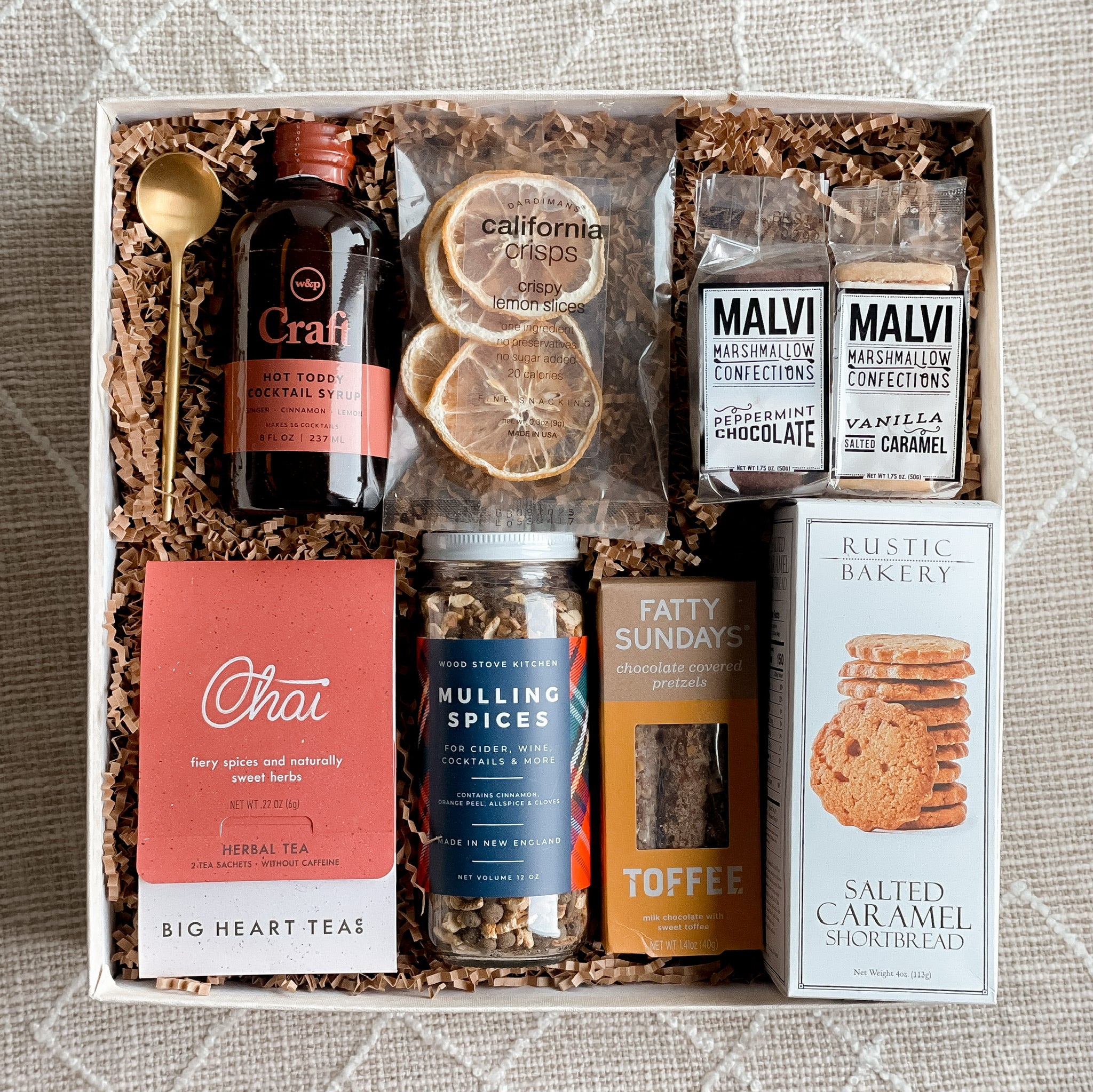 A typical gift includes our signature lidded box, linen paper insert, crinkle paper, branded seal, signature belly band, handwritten card, and, of course, the products.